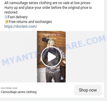 | Scam Ads | “All camouflage series clothing are on sale at low prices. Hurry up and place your order before the original price is restored. βοΈFast delivery π‘Free returns and exchanges. https://doctern.com/ Today only $8 Grinder Zip DOCTERN.COM Camouflage series clothing” |