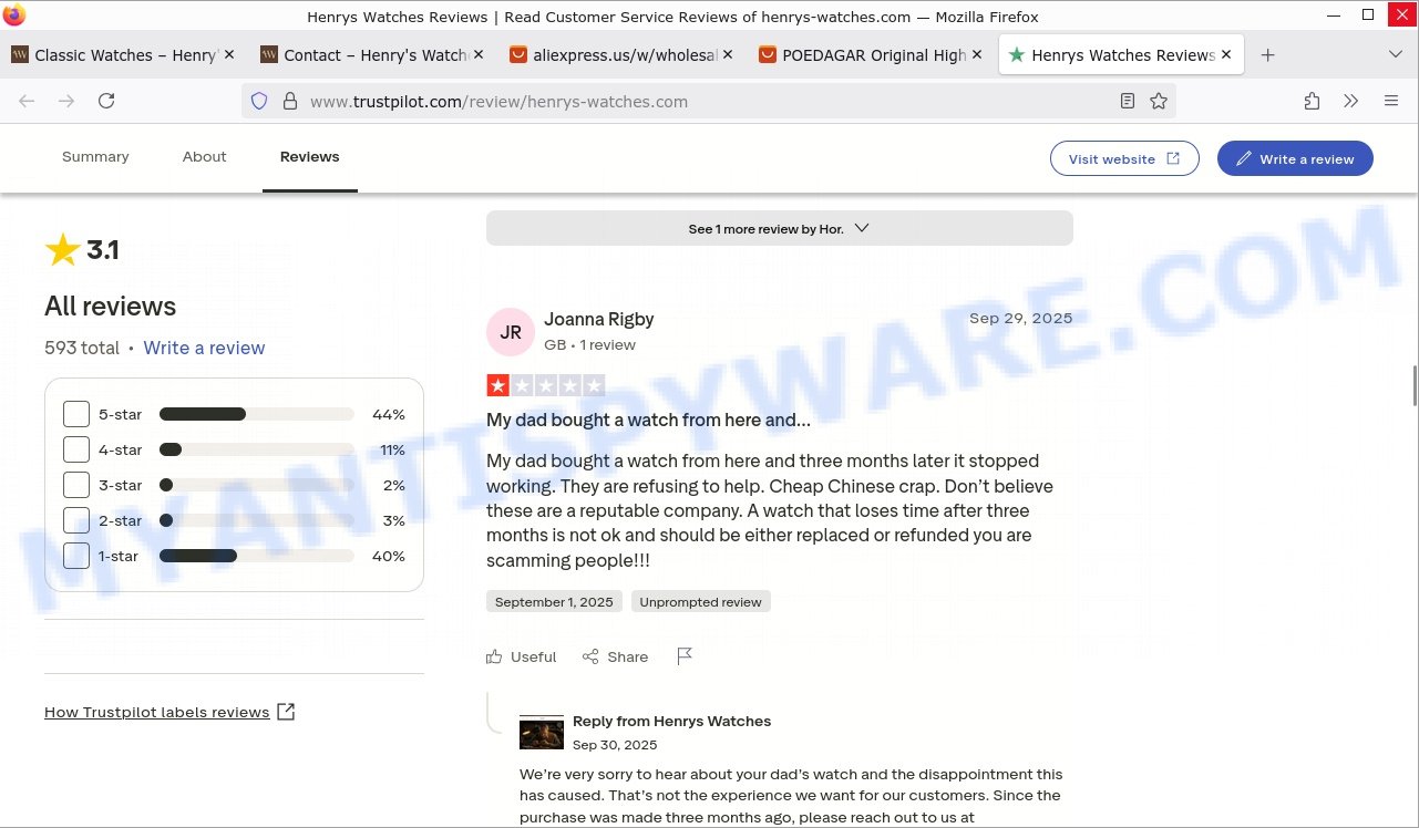 Bottom Line: Avoid purchasing from Henrys-Watches.com. If a luxury brand claims enormous discounts alongside an emotional closing sale, yet sells products identical to cheap imports, it’s a strong indicator of fraudulent activity. Always research thoroughly, check multiple independent review sources, and be wary of stores that refuse straightforward refund processes. Don’t be fooled by flashy marketing and fake testimonials—Henry’s Watches Closure Sale is not what it claims to be.