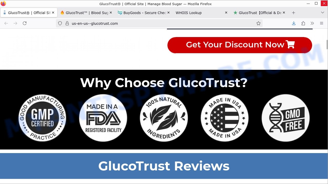 The GlucoTrust supplement appears to be a scam, relying heavily on fabricated 5-star reviews, misleading marketing claims, and questionable badges to falsely establish credibility. The promoters of GlucoTrust use persuasive but vague language to suggest miraculous improvements in blood sugar control, weight management, and overall health—claims that are not backed by any verifiable scientific evidence. The website features an overload of unverified certifications like “FDA Registered Facility” and “GMP Certified”, which can mislead consumers into trusting the product’s safety and legitimacy without real proof.