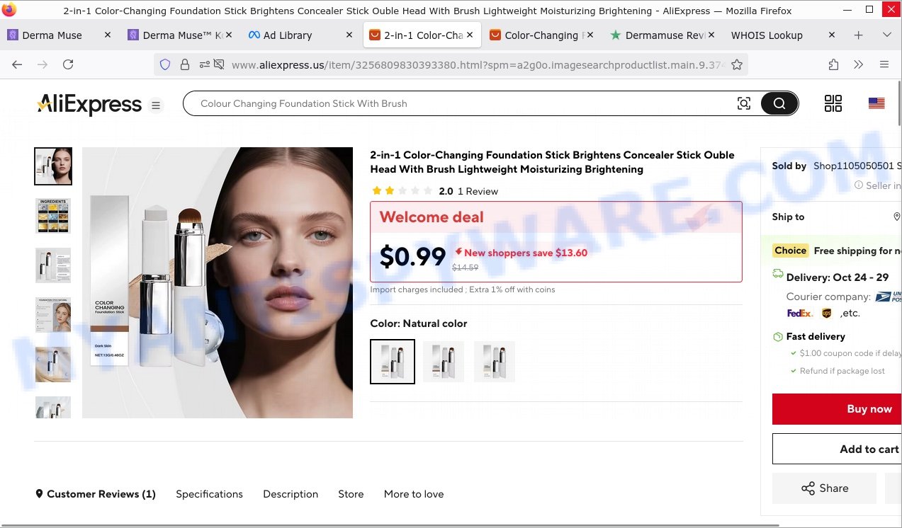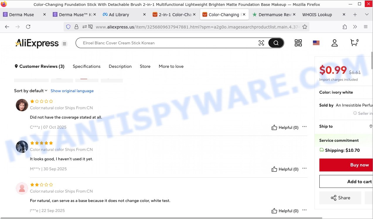 A reverse image search reveals identical products sold on AliExpress and other overseas marketplaces for as little as $0.99—a far cry from the steep prices charged on the official site. The high star rating and hundreds of “reviews” shown on Derma Muse’s page cannot be independently verified on trusted review platforms such as Trustpilot, where no ratings exist. Meanwhile, some buyer feedback on alternative sites complains the foundation does not change color, feels waxy, and fails to provide the claimed coverage.