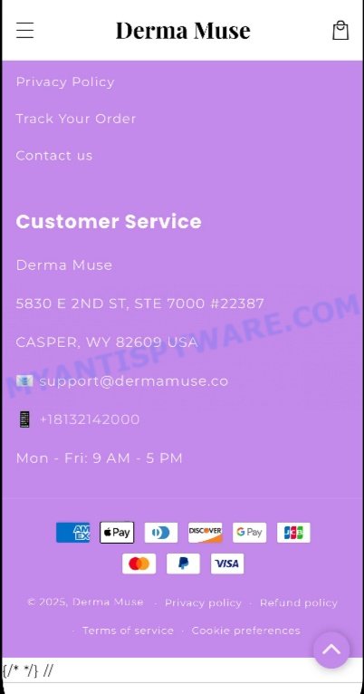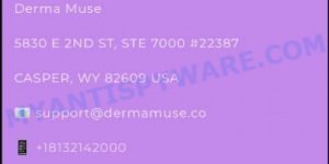 - 🔒 Website Claims and Ownership: The official domain dermamuse.co was created recently (September 2025) with the registrant information shielded for privacy. Contact information points to a virtual office in Casper, WY, and a phone number linked to another suspicious brand with a similar product and design template—”Radiant Muse”.