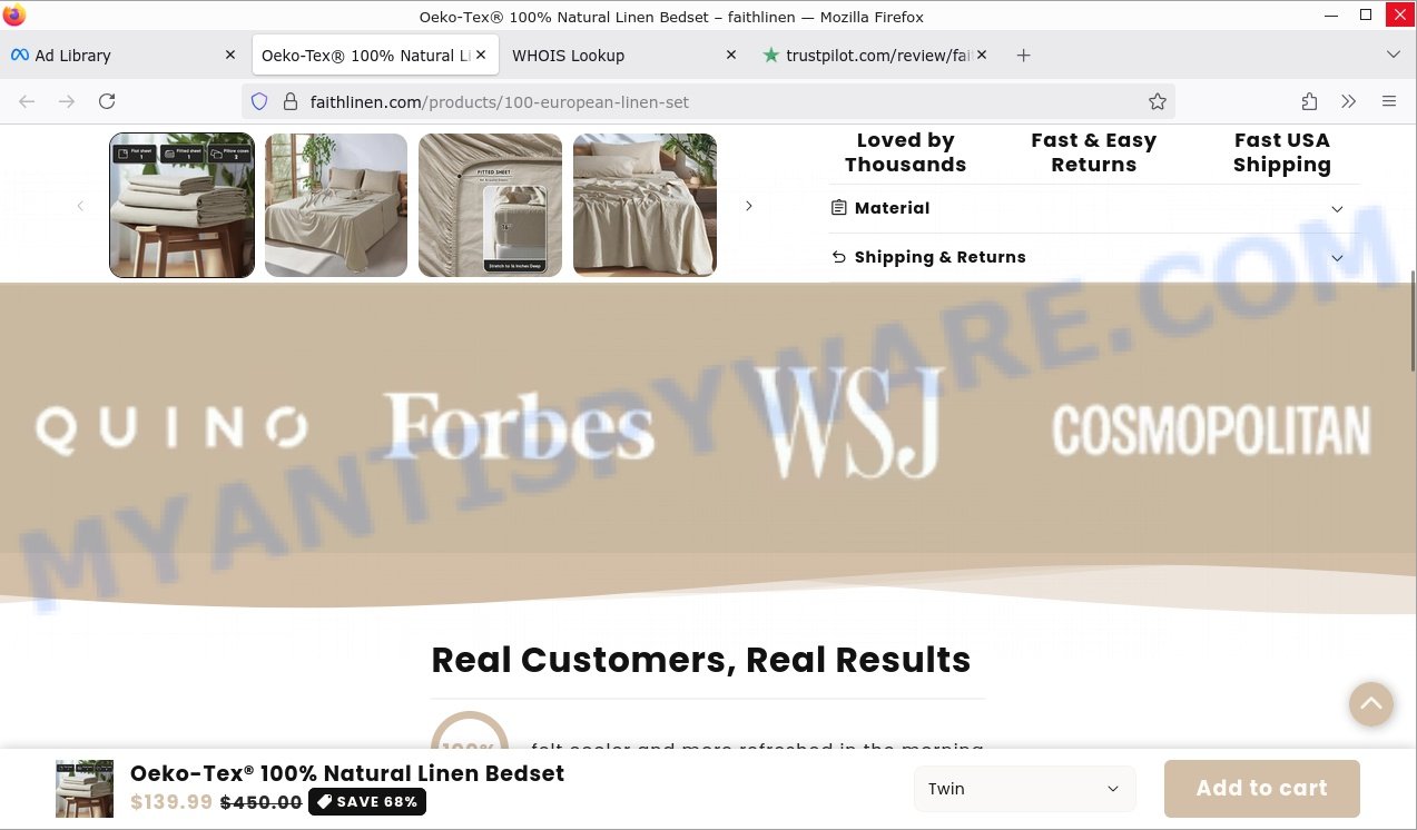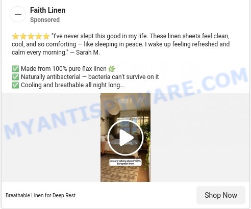 Faith Linen is promoted as a luxury bedding brand offering “European flax” linens with claims of 100% organic comfort and miraculous sleep benefits—but our research indicates that these claims lack credible evidence and the marketing uses deceptive tactics common in dropshipping scams.