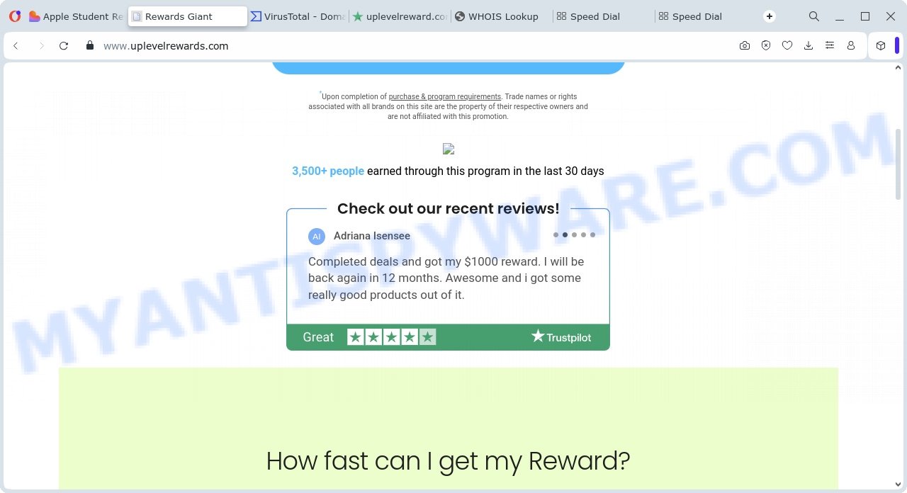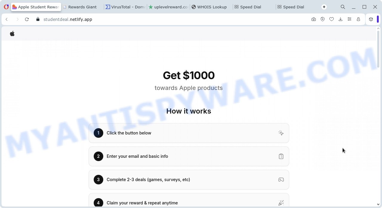 Instead of genuine rewards, victims are funneled into completing paid offers, downloading apps, or subscribing to services that generate affiliate commissions for the scam operators, while exposing themselves to financial loss, identity theft, and spam. Websites like studentdeal.netlify.app use misleading progress bars, fake Trustpilot badges, and false user testimonials to lure users in, despite no real connection to Apple.