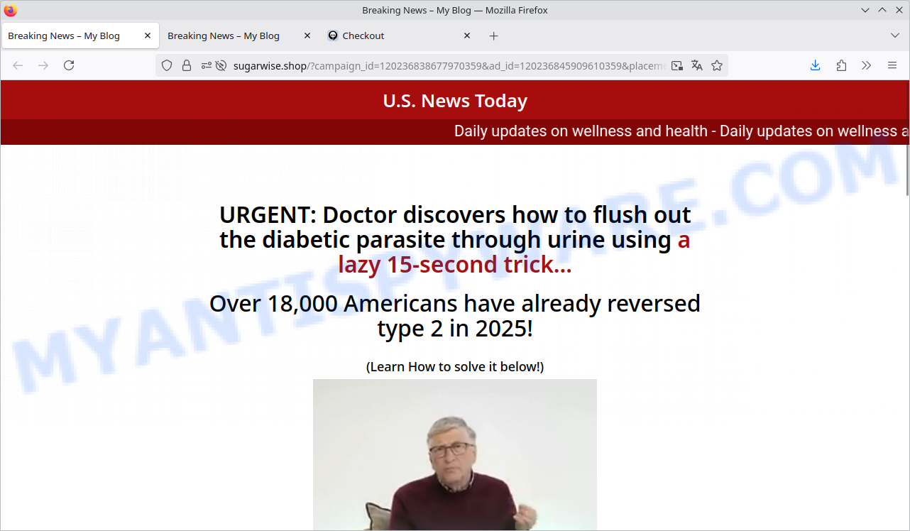 Users are directed to sugarwise.shop — a website designed to look like a legitimate news outlet with headlines mimicking breaking health news. It features fake doctor videos that never reveal the “15-second trick” but transition into pushing SugarWise capsules.