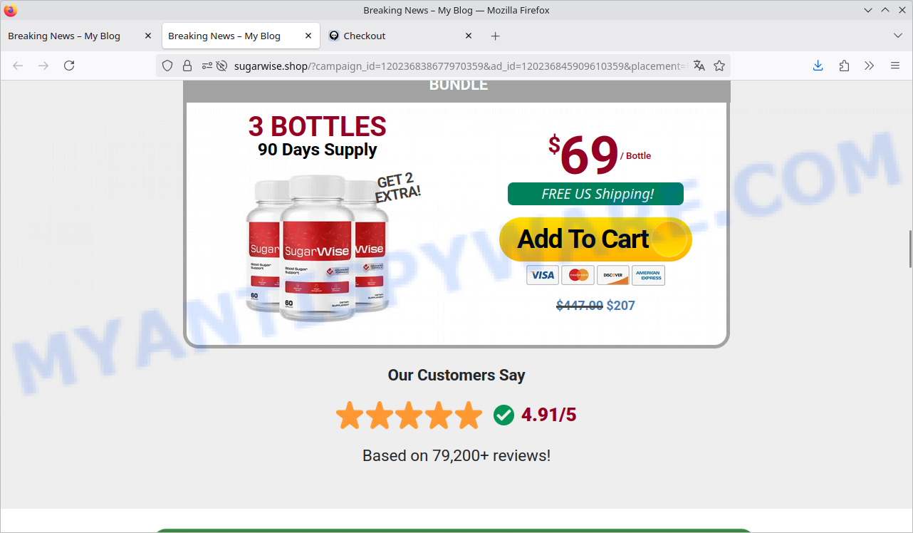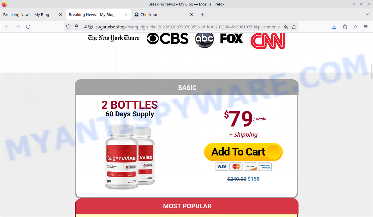 The scam begins with urgent ads featuring dramatic language about a doctor’s discovery or a “miracle method”. Clicking these ads directs users to a website designed to look like a reputable news article, complete with fake logos from well-known media outlets and fake viewer comments that falsely applaud the product’s effectiveness. At the core of the scheme is SugarWise pills, aggressively marketed as the sole solution to regulating blood sugar without diet or medication changes. The site pressures visitors with countdown timers, limited stock warnings, and seemingly exclusive discounts to spur quick purchases. The checkout process is handled through third-party platforms known for fraudulent supplement sales, further raising doubts about the product’s legitimacy.