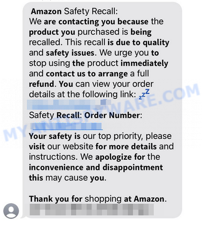 Scammers send texts or emails that look like official Amazon notifications, warning that a product you purchased is being recalled due to safety issues. The message urges you to stop using the product immediately and contact them for a refund.