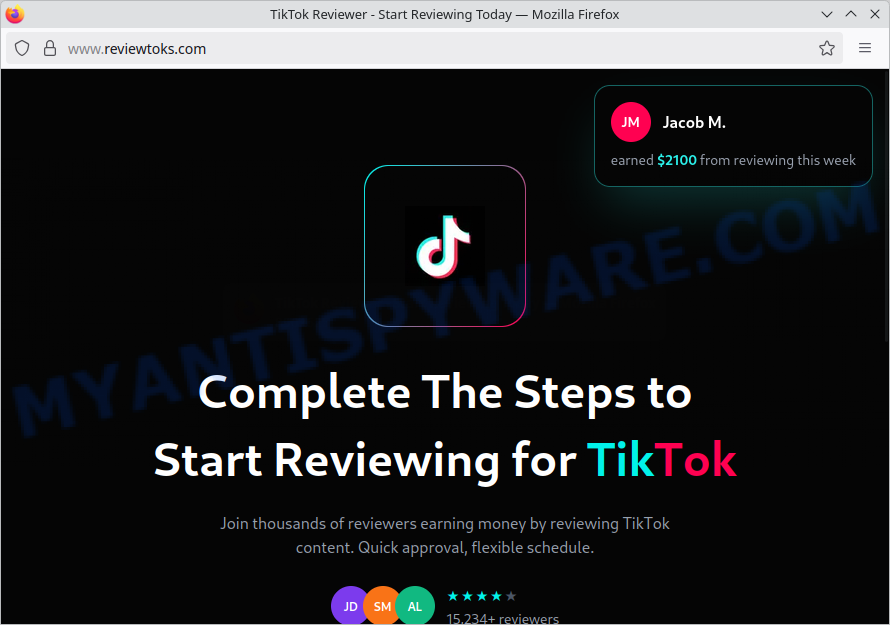 The ReviewToks.com is a scam, designed to deceive users with fake promises and misleading tactics. They falsely claim users can earn significant money by “reviewing for TikTok”, a service that does not exist nor is endorsed by TikTok. The sites use suspicious domain names, imitate TikTok’s branding to create a false sense of legitimacy, and display fake testimonials or earnings to lure unsuspecting users.