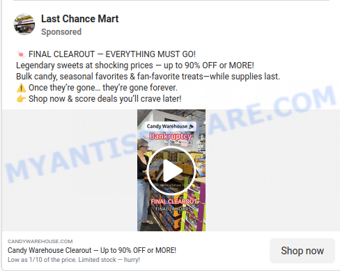 The scam kicks off with eye-catching Facebook posts from pages like “Last Chance Mart”, boasting “FINAL CLEAROUT — EVERYTHING MUST GO!” and urging users to “Shop now” for incredible deals. The ad’s link text mentions candywarehouse.com, but clicking actually directs users to the suspicious candy-warehouseus.com site, which is operated by unknown parties.