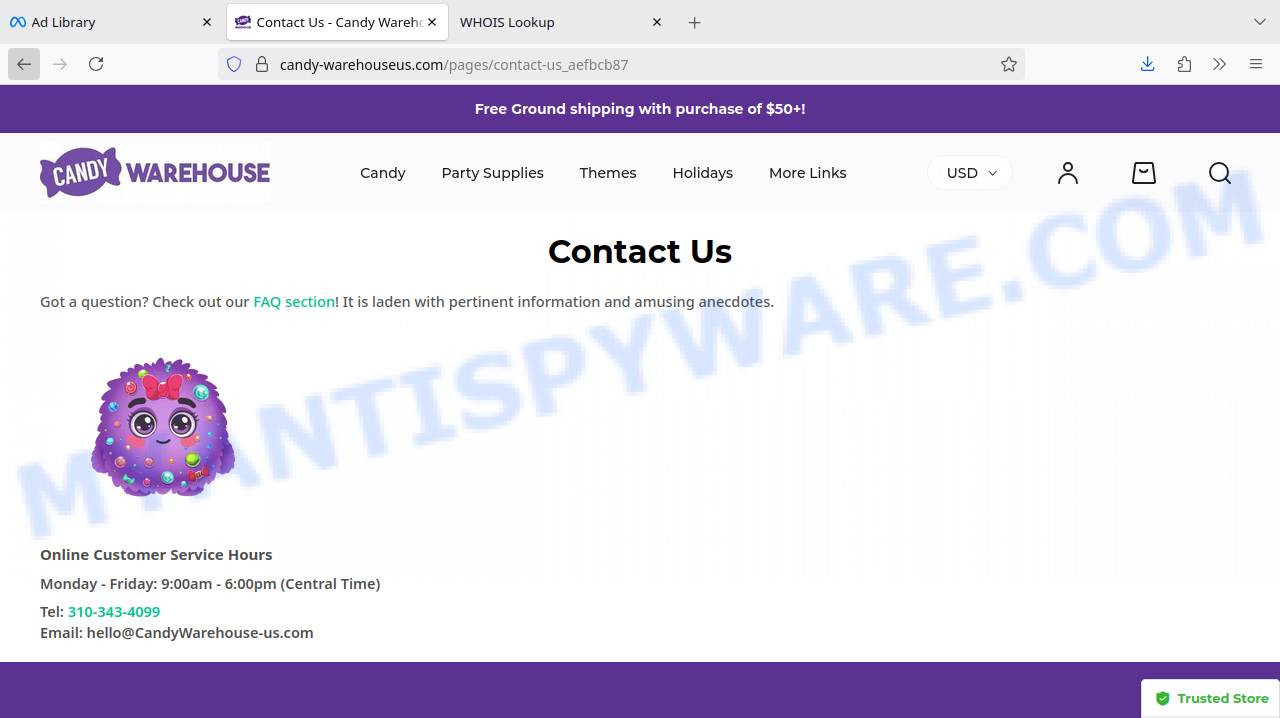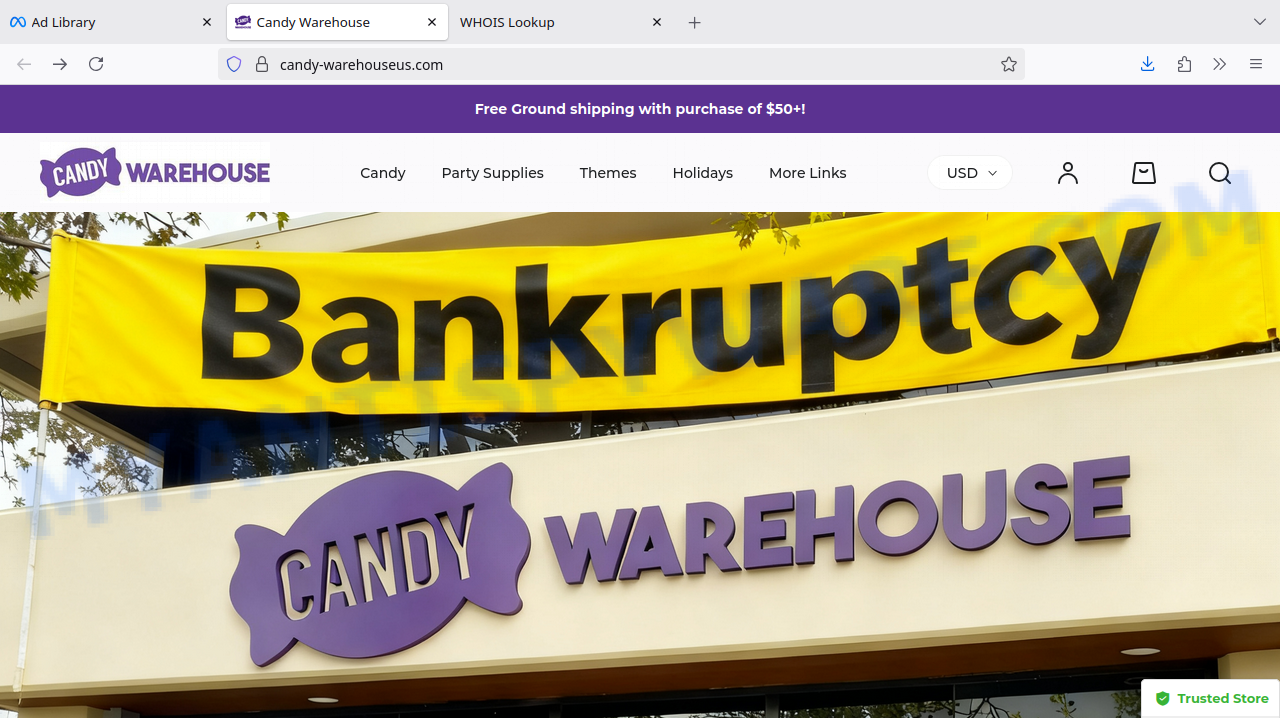 They direct users to candy-warehouseus.com, a fake website designed to look like the official Candy Warehouse store. The site copies logos, storefront images, and uses phrases like “Bankruptcy Sale” with a yellow banner to appear legitimate. However, the domain was just created recently and is registered to a suspicious overseas (China) source, with mismatched contact emails and fake “Trusted Store” badges.