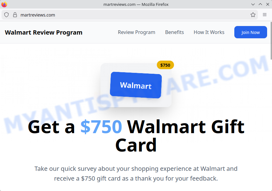 The MartReviews.com ‘Walmart Review Program’ is a scam, using deceptive promises and fabricated rewards to lure victims into wasting time or potentially compromising their information. The site falsely claims you can earn up to $750 Walmart gift cards simply by completing quick surveys about your shopping experience—an offer that is far too good to be true.