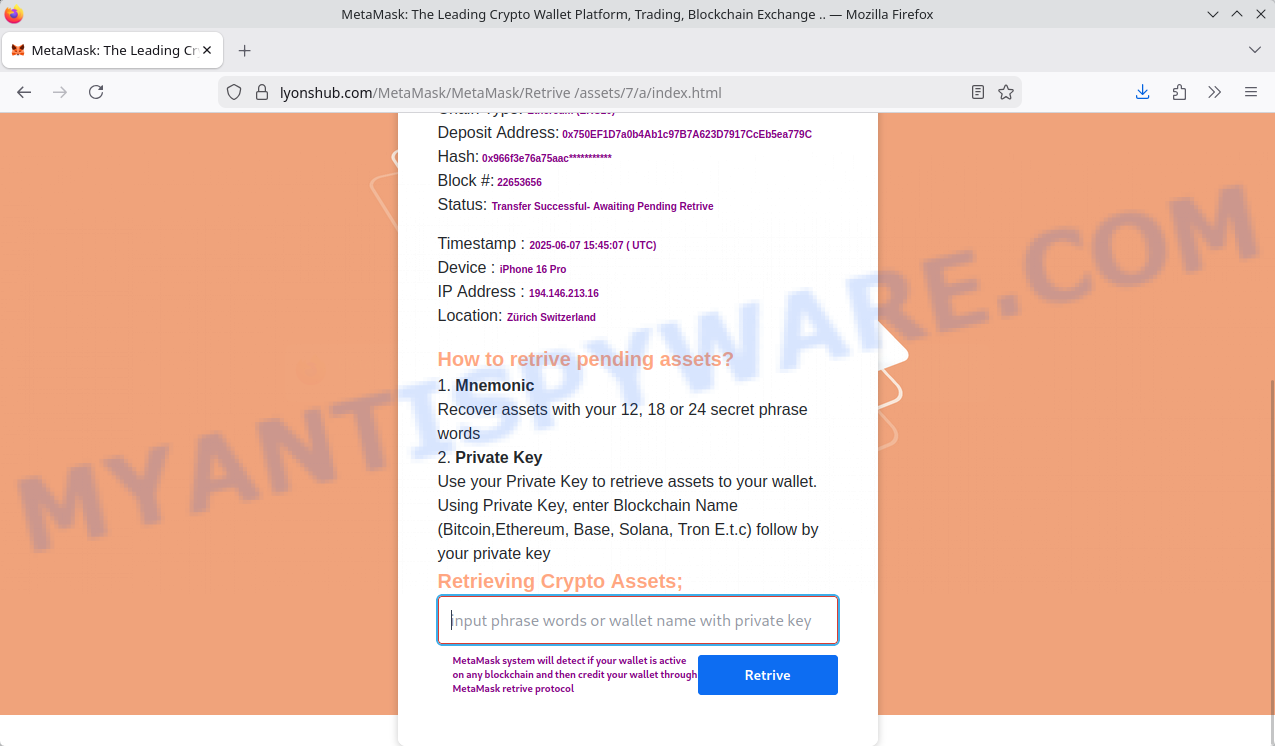 The email impersonates MetaMask and ConsenSys, including fake technical details such as transaction hashes, wallet addresses, and blockchain information to appear convincing. It urges you to click a “Retrieve ETH” button that leads to suspicious domains (like eonzeus.com and lyonshub.com), which are not affiliated with MetaMask or any legitimate crypto service.