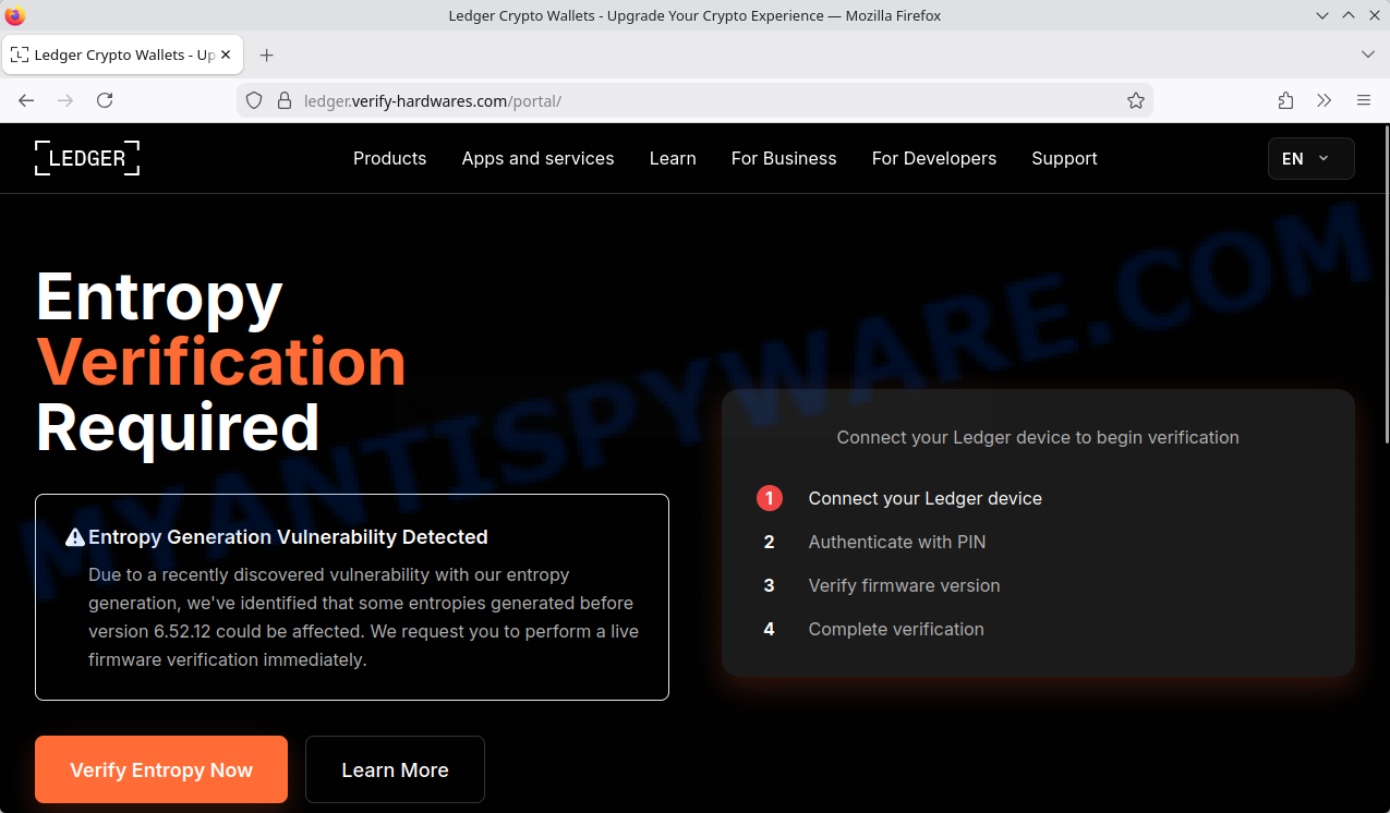 Instead of providing a legitimate security update, this scam attempts to harvest sensitive information that allows criminals to gain full access to victims’ crypto assets and irreversibly steal their funds. The fake website mimics Ledger’s branding but uses suspicious URLs and subdomains that are not connected to the official Ledger domain (ledger.com). It also requests unusual and sensitive actions, like “entropy verification” and device PIN authentication, which legitimate Ledger communications never do.