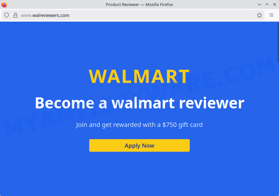 WalReviewers.com lures victims by offering a lucrative $750 Walmart gift card just for signing up and reviewing products. This enticing reward is fake and used to build trust quickly.