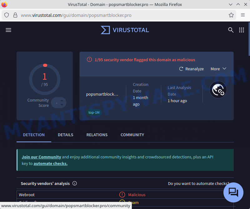 VirusTotal flagged Popsmartblocker.pro as malicious: