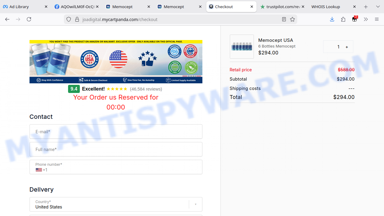 - 💸 Expensive Product Packages With Urgency Tactics: Memocept is sold in multi-bottle packages ranging from $49 to $79 per bottle, with “limited time” discounts and countdown timers pressuring impulsive purchases. The checkout process, handled by an opaque payment processor named Cartpanda, pushes express shipping upsells and requires extensive personal and payment information under the guise of secure processing.