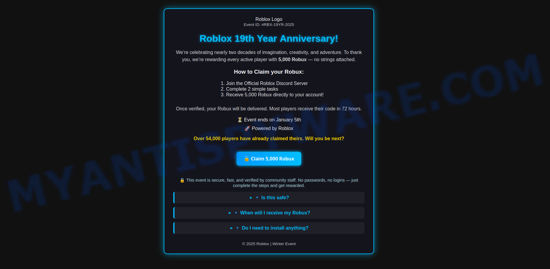 | Event Details | Fake “Roblox 19th Year Anniversary” with Event ID: #RBX-19YR-2025 |