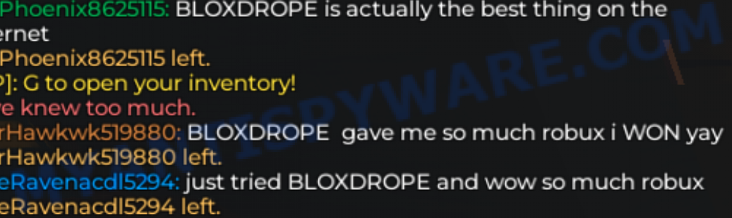The Bloxdro, Bloxdrope “Free Robux” is a scam, relying on spam bots, fake messages, and deceptive tactics to lure Roblox players into visiting a fraudulent website. The scammers behind Bloxdro use repeated spam messages across multiple Roblox games, sent by suspicious accounts that join a server, post once, and leave immediately—clear signs of automated bot behavior.