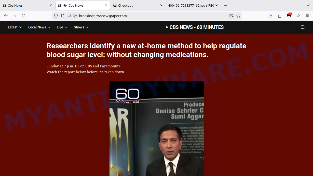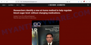 They create websites styled like reputable news broadcasts (e.g., breakingnewsnewspaper.com with CBS News – 60 Minutes branding) that claim to reveal secret diabetes cures. These sites are carefully designed with copied logos and headlines but have no legitimate news outlet affiliation or verifiable authorship.