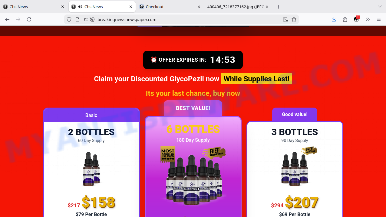 Instead of an effective, medically supported treatment for blood sugar regulation or type 2 diabetes reversal, visitors are presented with an elaborate sales funnel that heavily pressures for immediate purchases through countdown timers, scarcity tactics, and fake “60-Day Money Back Guarantee” badges. The small bottles labeled Glycopezil or Glycopazil come with unsubstantiated claims and no credible scientific evidence or third-party certification to back them up.
