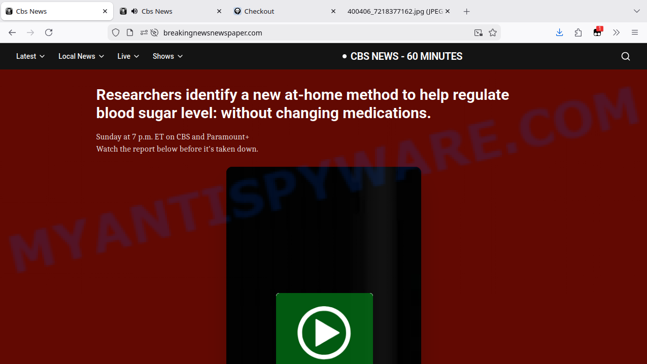They create websites styled like reputable news broadcasts (e.g., breakingnewsnewspaper.com with CBS News – 60 Minutes branding) that claim to reveal secret diabetes cures. These sites are carefully designed with copied logos and headlines but have no legitimate news outlet affiliation or verifiable authorship.