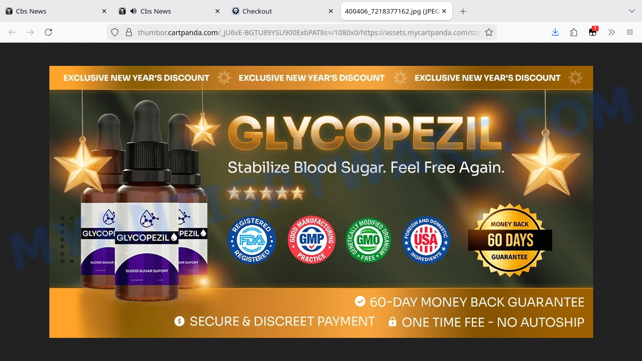 The Glycopezil “Glucose Reset Ritual” is a scam that uses deceptive marketing tactics, fake celebrity endorsements, and fabricated expert testimonials to create a false impression of legitimacy. The product is promoted via a misleading news-style webpage on breakingnewsnewspaper.com and a suspicious checkout on a mycartpanda.com subdomain, using copied branding from CBS “60 MINUTES” and names like Dr. Phil and Halle Berry without any real association.