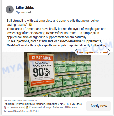 - 🌐 Suspicious Marketing Channels: Ads promoting Healrize patches appear on Facebook under questionable profiles like “Lillie Gibbs,” and lead to the dubious domain dailywellnesssupplyhub.shop, which shows no credible background or established reputation.