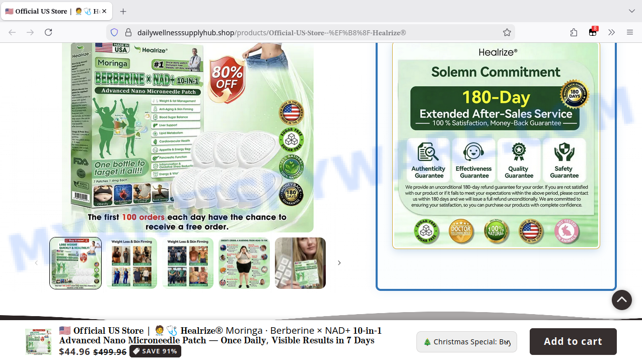 Summary: The Healrize Moringa · Berberine × NAD+ 10-in-1 Patch’s marketing is riddled with fake testimonials, unverifiable “official” claims, dubious certifications, and scam-like pricing and sales tactics. These factors strongly suggest that this product is part of an online scam designed to exploit consumers seeking easy health solutions. It’s highly recommended to avoid purchasing from dailywellnesssupplyhub.shop or related links, and instead seek advice from qualified healthcare professionals for safe and effective weight loss and wellness treatments.