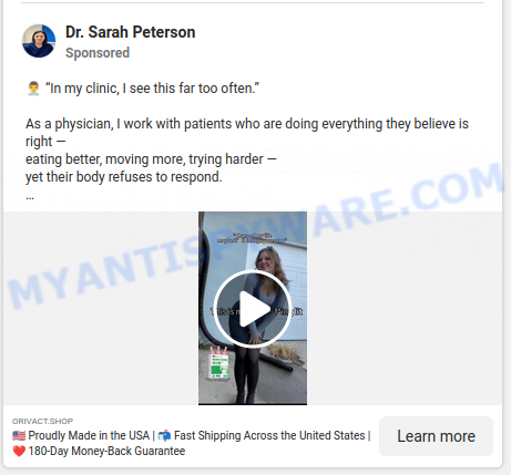 • 🌐 Suspicious Social Media Ads: The campaign starts with sponsored posts from unverified personas like “Dr. Sarah Peterson,” sharing anecdotal patient stories and directing traffic to questionable domains such as orivact.shop and orivitax.com. These ads emphasize superficial success narratives without credible backing.