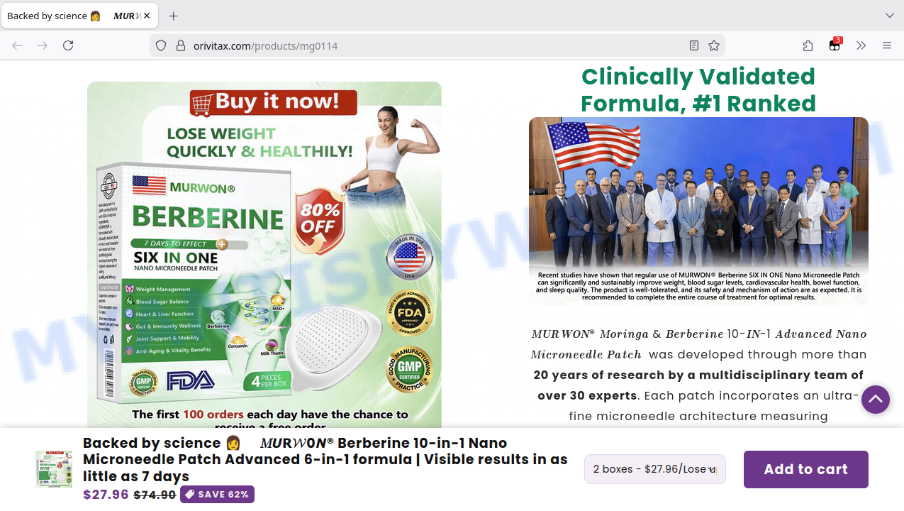 The MURWON “Berberine 10‑in‑1 Nano Microneedle Patch” is a textbook example of modern weight‑loss scam: medical‑style branding, fake authority, and wild promises of a “Cellular‑Level Fat Reset” in just 7 days, all funneled through slick sales pages on throwaway domains like orivact.shop and orivitax.com. Our investigation focuses on how this campaign borrows the language of science and medicine to sell what is essentially an unproven diet patch.