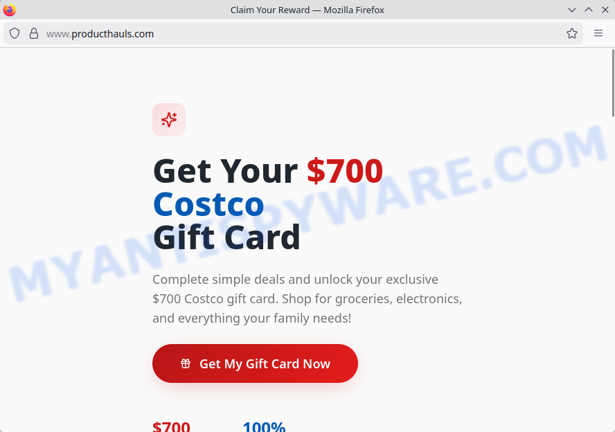 | Offer Description | ProductHauls.com promises a $700 Costco gift card when users complete 3 to 5 deals. The website claims users can instantly receive the gift card by email after verification, encouraging quick sign-ups and deal completions. | Negative (Unrealistic rewards linked to completing simple tasks raise suspicion) |